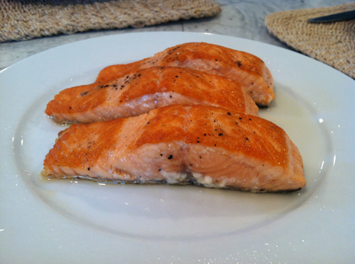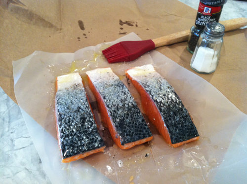 Take 2-4 salmon fillets, brush ’em with olive oil on both sides, then salt and pepper them on both sides.
